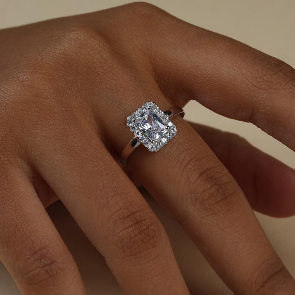 خاتم من الفضة عيار 925 ومطلي بالروديوم ، ومزين بأحجار الزركون بتقنية ترصيع مشابه للألماس